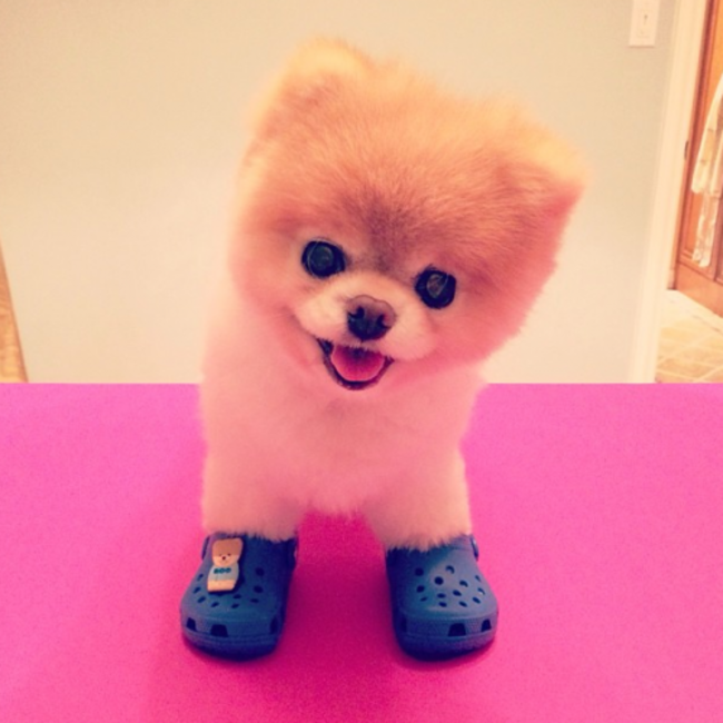 WE’RE NOT SURE about this. On the one hand, there’s the ‘Cutest Dog in the World’, Boo. On the other, the ‘Ugliest Footwear in the World’, Crocs.
