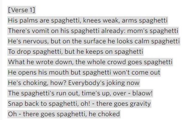 “THERE’S VOMIT ON his sweater already, Mom’s spaghetti” is one of the most iconic lyrics of the 2000s.