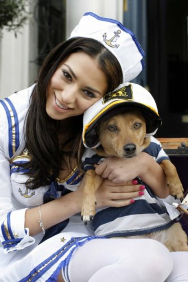 4. Putting her hand on a greyhound while wearing a Santa suit