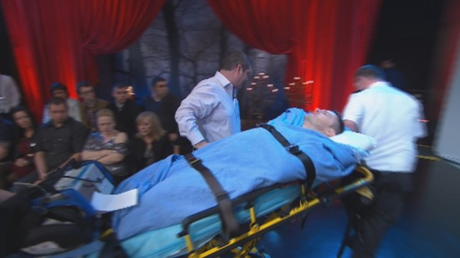 As the audience watches on in horror, the stunt is terminated and Barry is wheeled out of studio so the team can work to “save his life”.