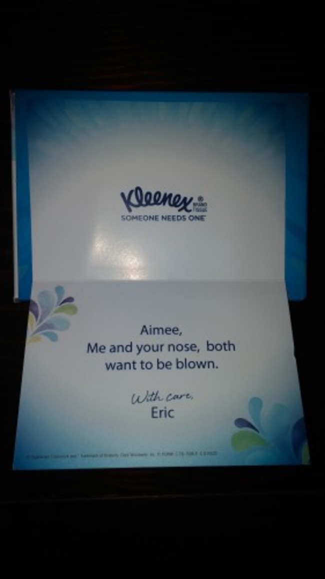 Dear Eric, why don’t you keep the Kleenex. You’re going to need them more than me. Aimee