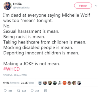 THERE HAS BEEN an outpouring of outrage at Michelle Wolf, the comedian who hosted Sunday Night’s White House Correspondents’ dinner.