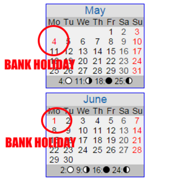 Now look at the bank holidays over the summer in Ireland.