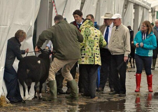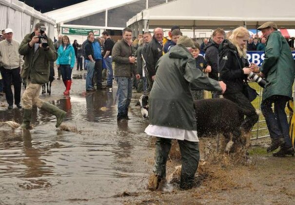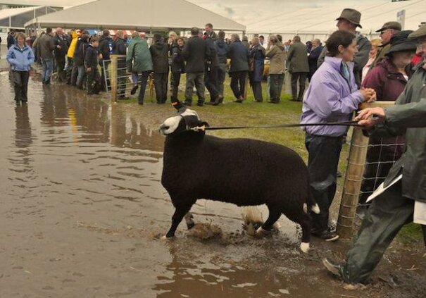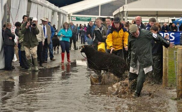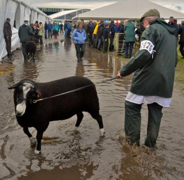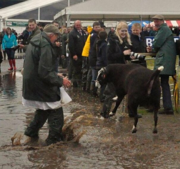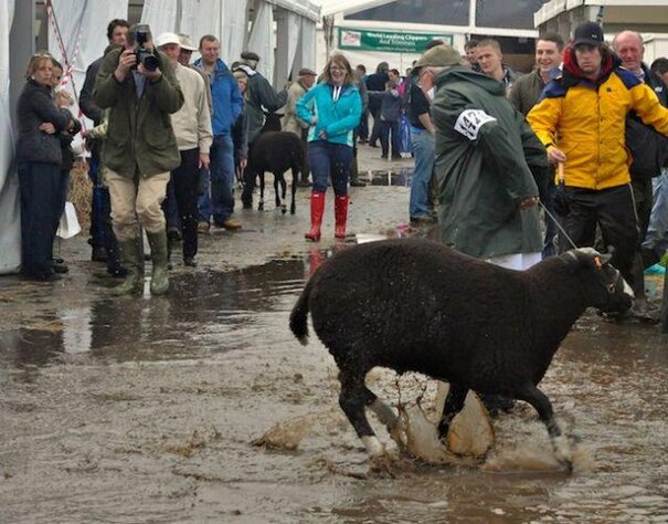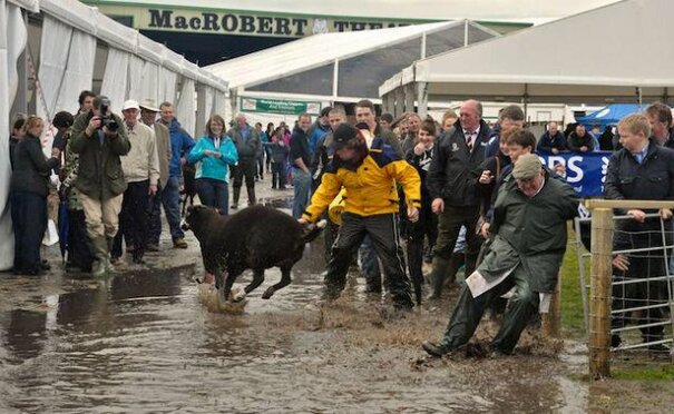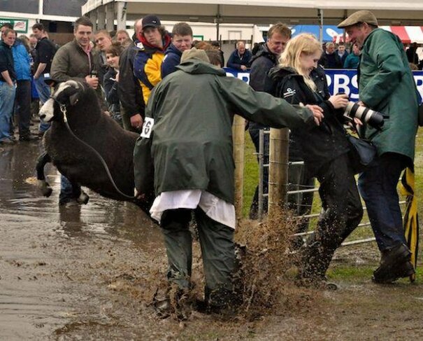 The sheep were wading through floods due to heavy rains and apparently this particular ram wasn’t happy with the conditions and took his handler Charles Scott with him for a ride.