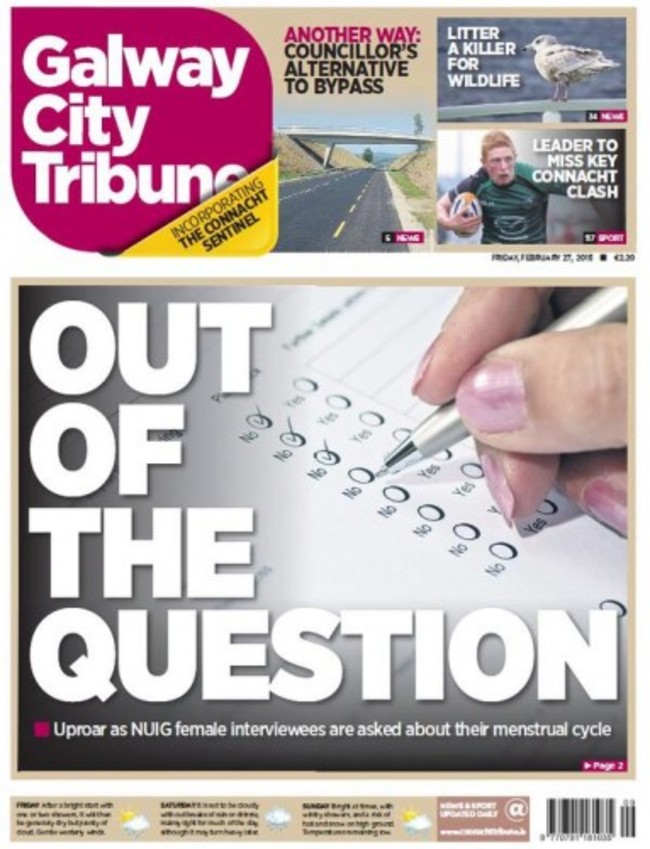 PROSPECTIVE EMPLOYEES of NUI Galway must answer questions about their menstrual cycle in a ‘pre-employment health questionnaire’, reports the Galway City Tribune today.
