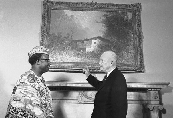 President Dwight Eisenhower points to an oil painting on the wall of his White House office in Washington in 1961. The art work is a Bavarian scene owned by Dr. Howard Snyder, Eisenhower'’s personal physician.(AP Photo/Bill Allen )