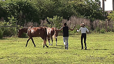 This time, she’s prancing around a meadow with horses. As she tells us, “When you, your partner and other creatures [gestures towards horse] move independently, you can not only get fit, you can set your spirits free.” Right.