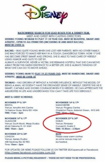 The auditions will take place in Filmbase in Dublin 2 on 23 and 24 November.