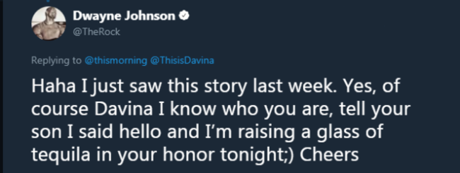 Yes, of course Davina I know who you are, tell your son I said hello and I’m raising a glass of tequila in your honor tonight … Cheers.”